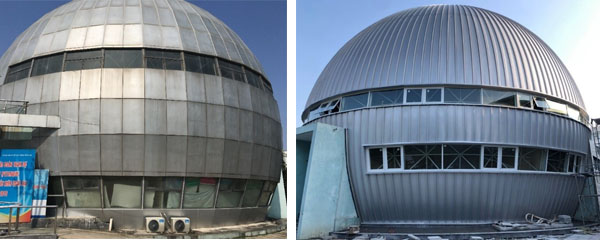 Trên cơ sở yêu cầu của Chủ đầu tư và tình trạng thực tế của Nhà thi đấu, E-Power đã đề xuất thay đổi hoàn toàn phương án tấm ốp nhôm nhựa thông thường như hiện tại bằng hệ mái kim loại EuroZip trải dài không mối nối và có thể uốn cong đa chiều, đáp ứng yêu cầu của thiết kế